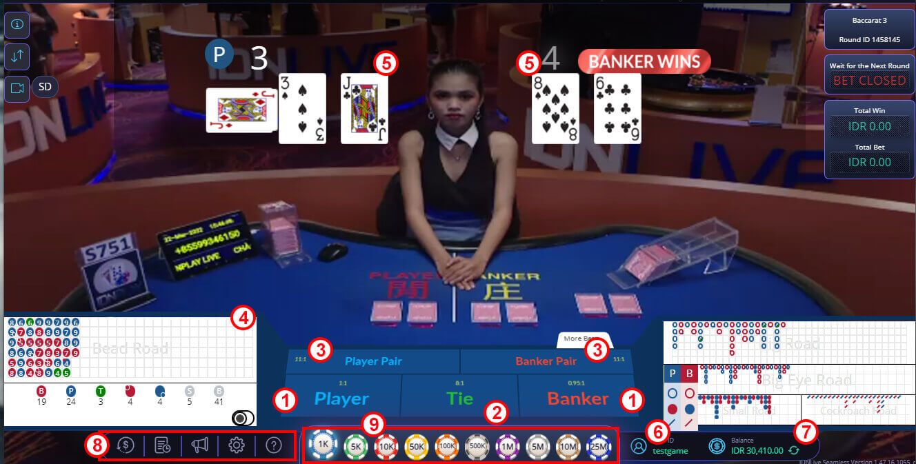 - Player / Banker : Pemain bertaruh untuk kartu Player / Kartu Banker
